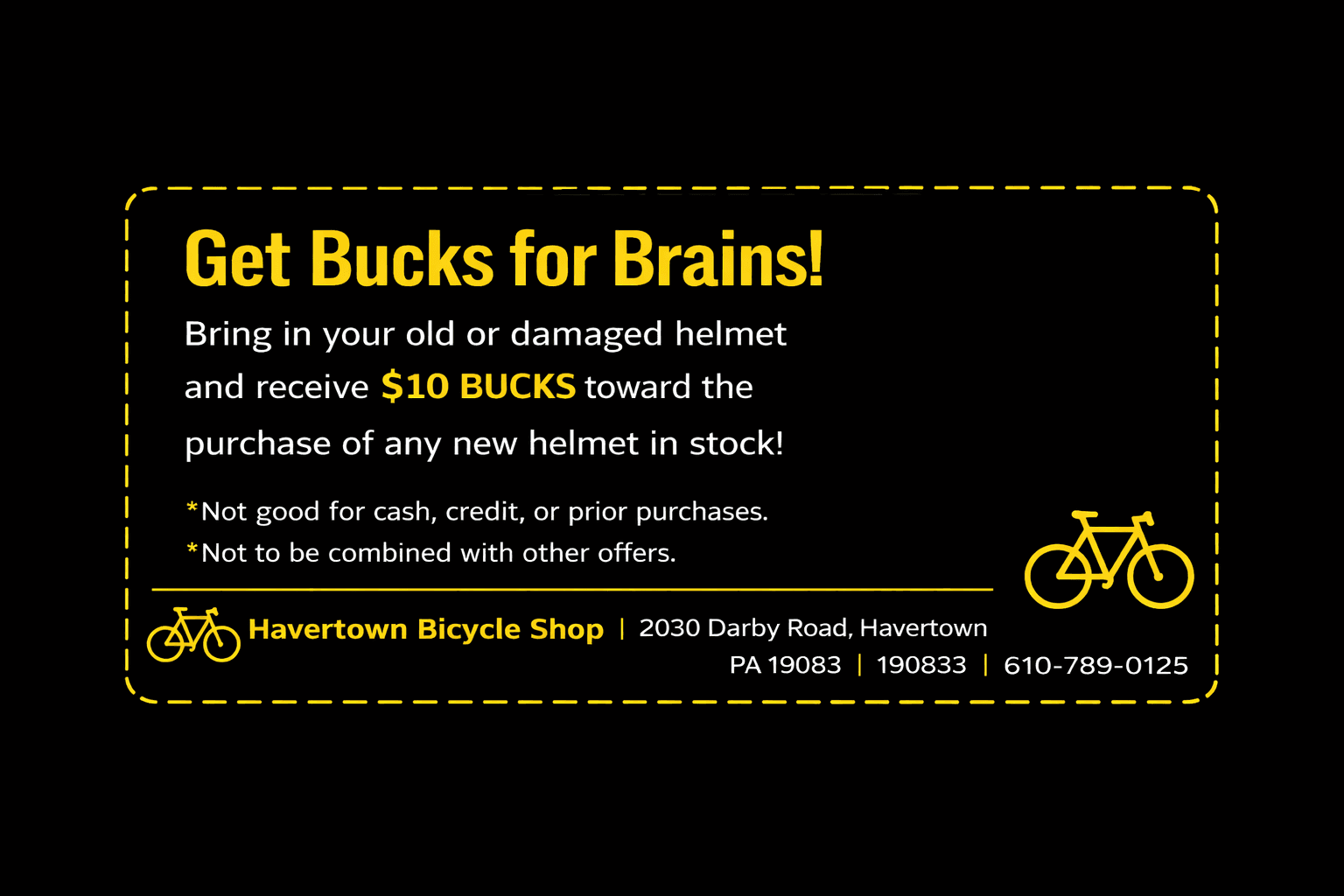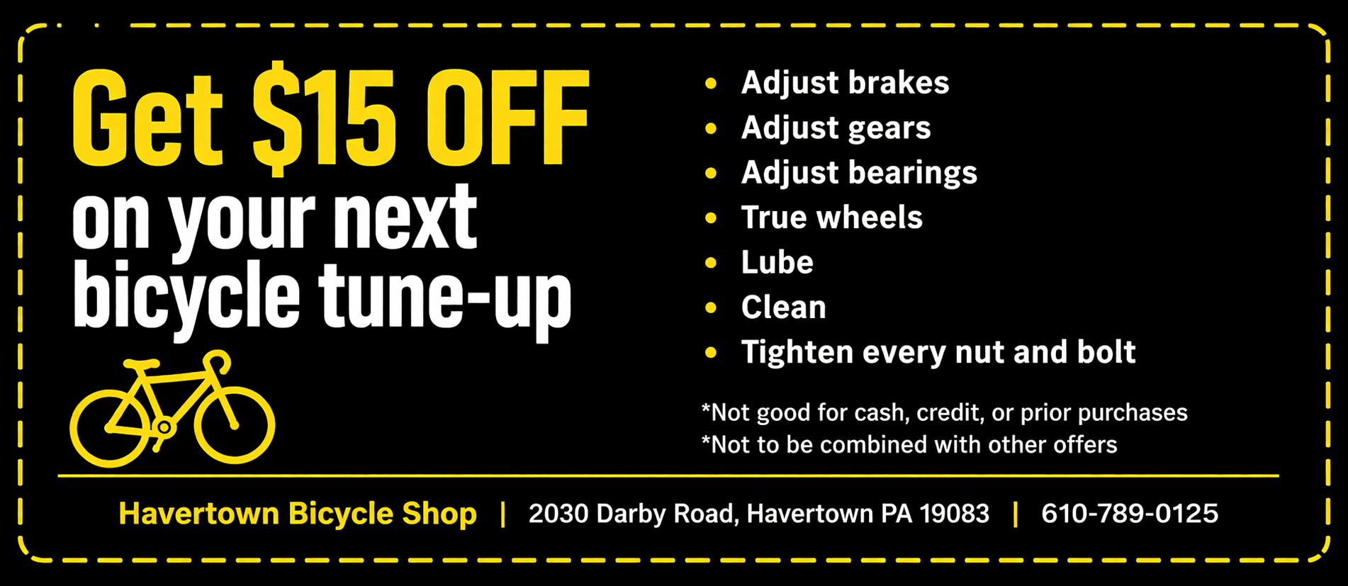 Great deals at Havertown Bicycle Shop — from free tune-ups to helmet trade-ins. Stop in and take advantage!